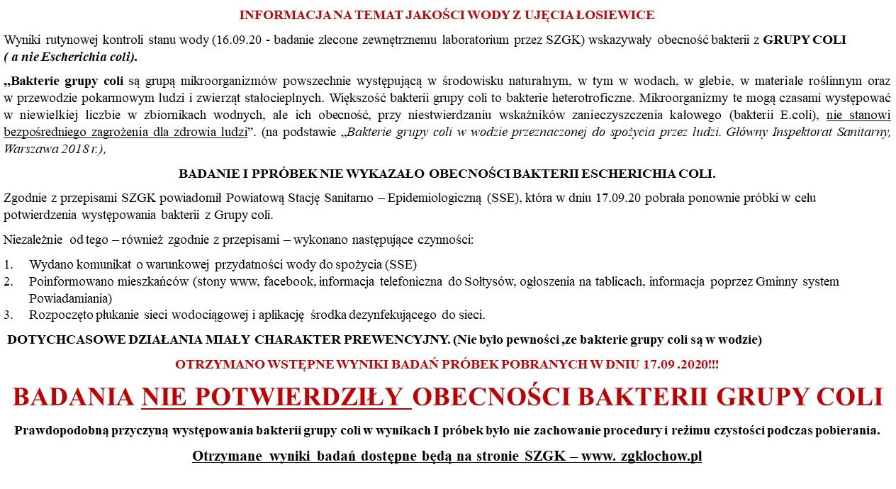 Zgodnie z zaleceniem Powiatowej Stacji Sanitarno – Epidemiologicznej określono warunkową przydatność do bezpośredniego spożycia (tylko po przegotowaniu) wody dostarczanej z ujęcia w Łosiewicach.