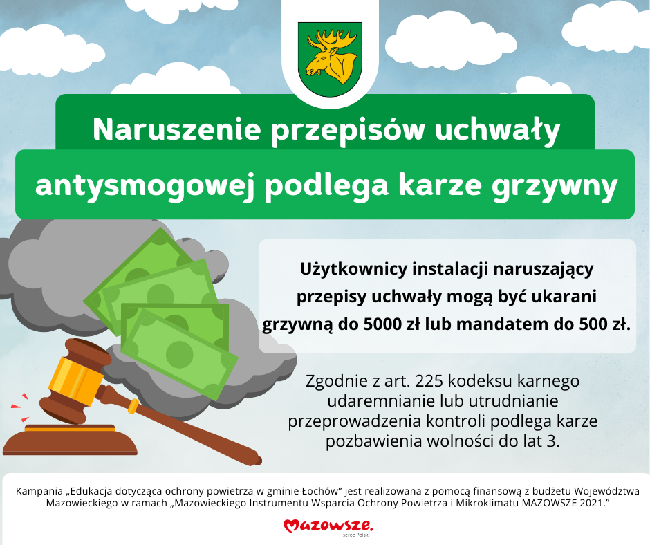 Przestrzeganie przepisów uchwały antysmogowej obowiązującej na terenie województwa mazowieckiego jest kontrolowane poprzez sprawdzanie rodzajów i jakości stosowanych paliw. Użytkownicy instalacji naruszający przepisy uchwały mogą być ukarani grzywną do 5000 zł lub mandatem do 500 zł. Należy pamiętać, że zgodnie z art. 225 kodeksu karnego udaremnianie lub utrudnianie przeprowadzenia kontroli podlega karze pozbawienia wolności do lat 3.