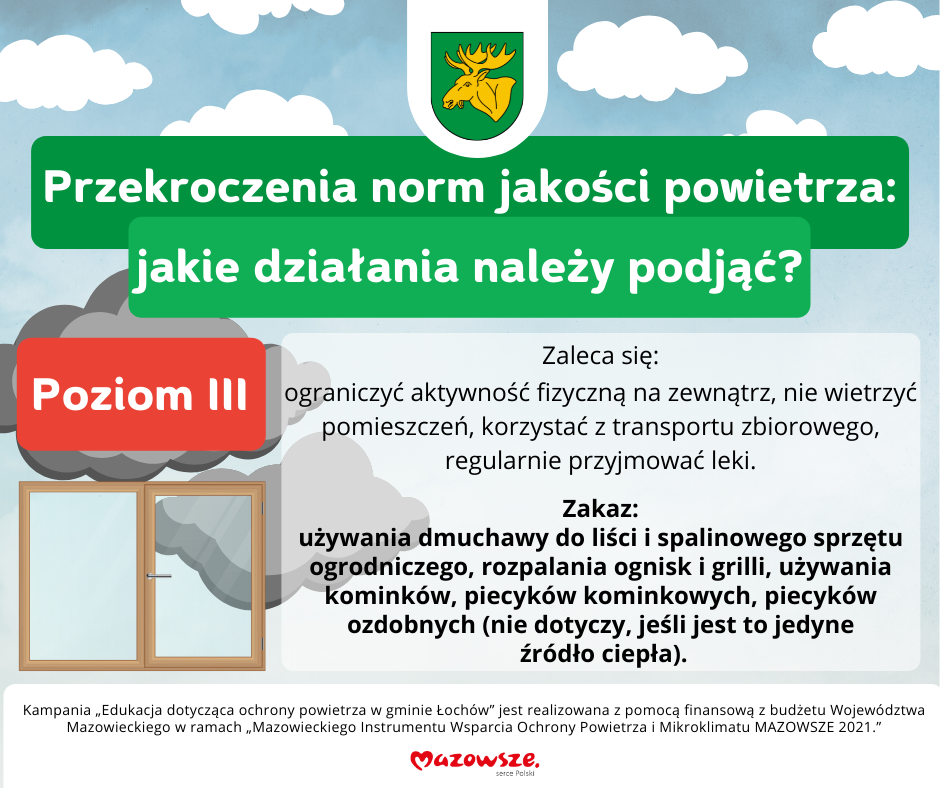 Zgodnie z założeniami Programu Ochrony Powietrza dla obszaru województwa mazowieckiego, w tym również dla terenu gminy Łochów, istnieje możliwość wystąpienia powiadomień Głównego Inspektoratu Ochrony Środowiska w przypadku ryzyka przekroczenia norm jakości powietrza w Twoim miejscu zamieszkania? Pamiętaj, aby zapoznać się z informacjami, jakie działania należy podjąć i do jakich zaleceń się zastosować.