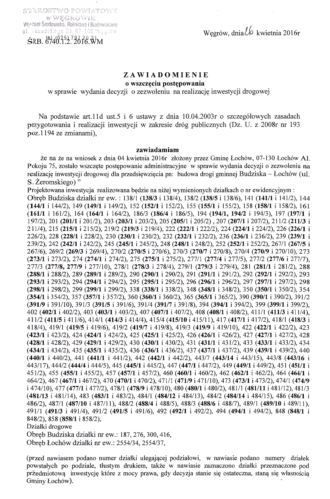 Zawiadomienie o wszczęciu postępowania w sprawie wydania decyzji o zezwoleniu na realizację inwestycji drogowej